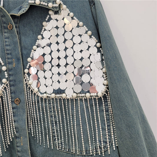 Camisa vaquera con detalles en perlas y lentejuelas , talla única/ ocstr
