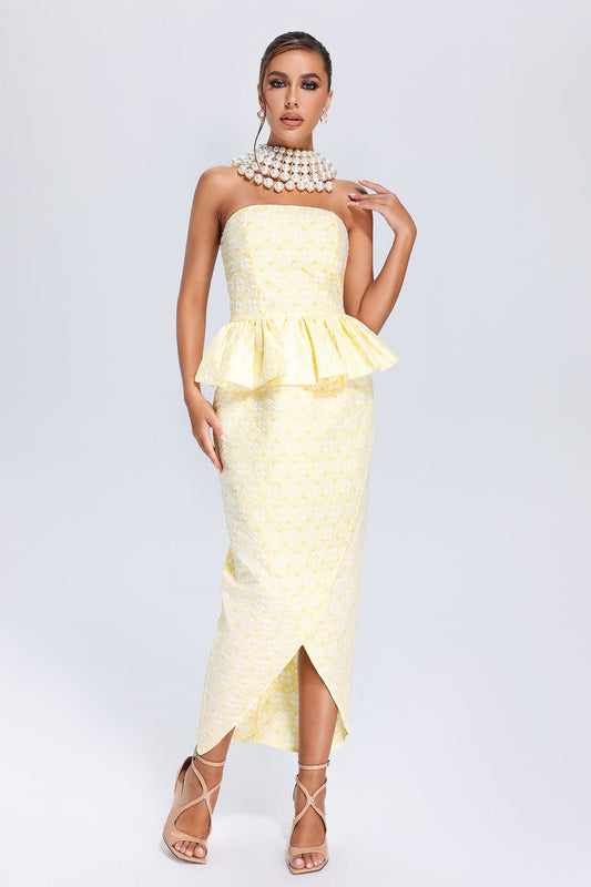 Vestido amarillo estampado , palabra de honor , con volantes en zona cadera
