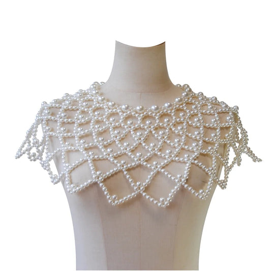 Collar abierto con perlas blancas y flecos , caído en hombros