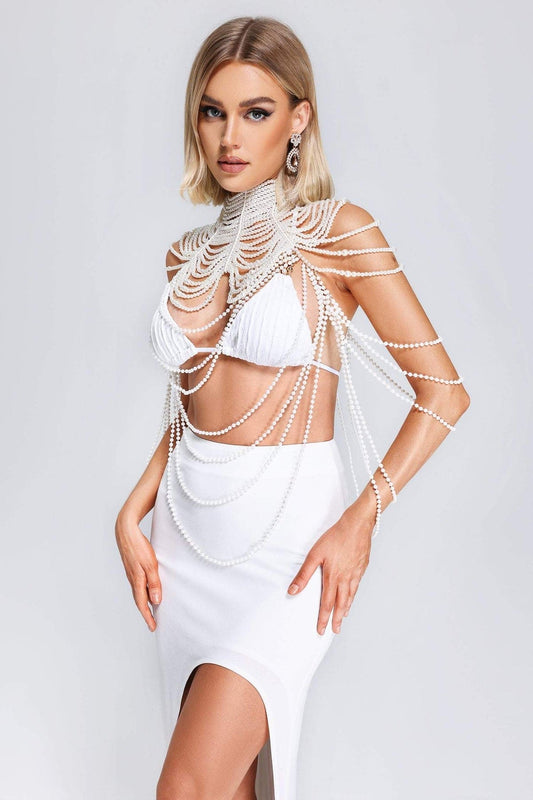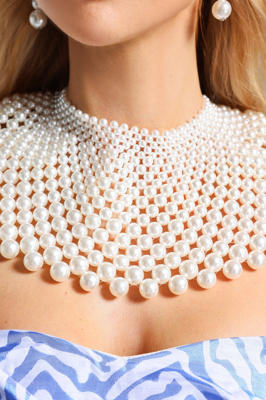 Collar largo de perlas blancas con detalles en hombro y espalda