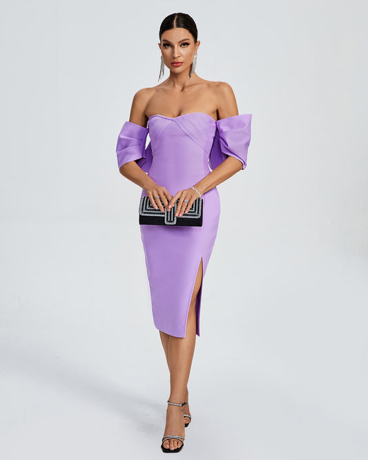Vestido bandage color Lila, hombro descubierto y detalle de lazos