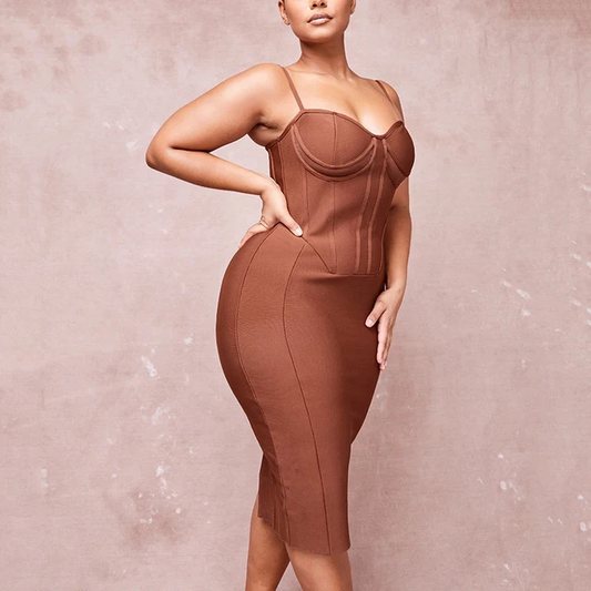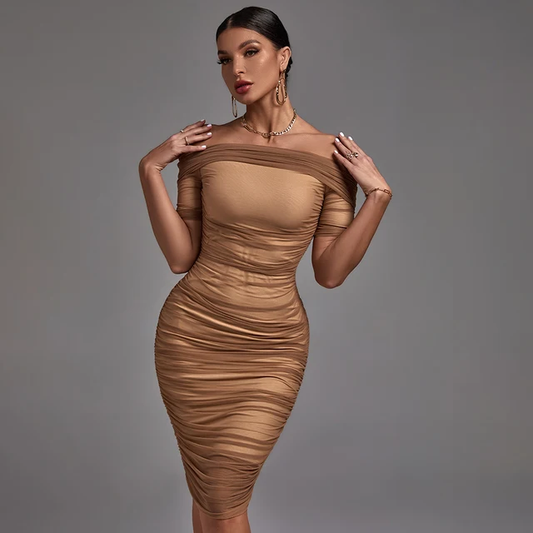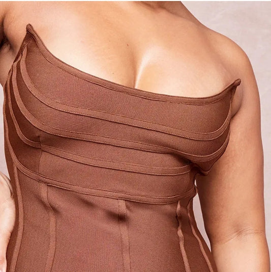 Vestido bandage marrón con flores en relieve en escote colores bronce colección ocsmr