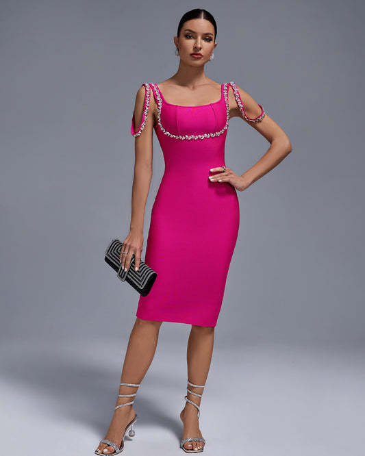 Vestido corte sirena bandage rosa con detalles en plumas en escote