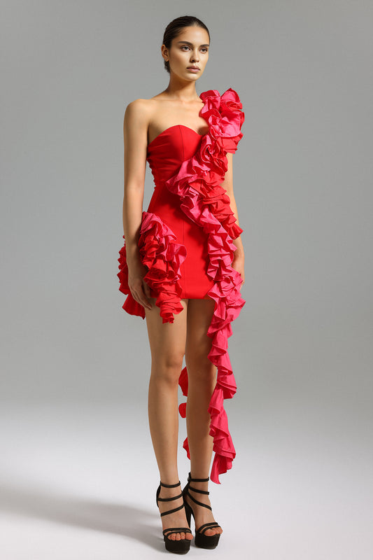 Vestido corto largo lentejuelas rojas con plumas colección ocs