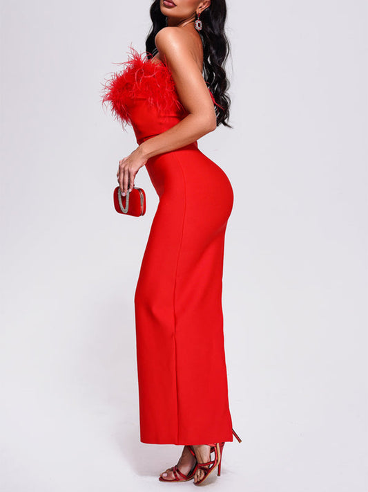 Vestido largo rojo bandage , hombros descubiertos atado en cuello
