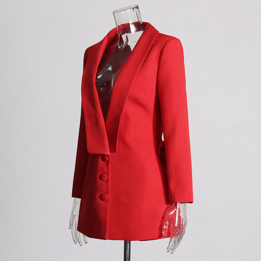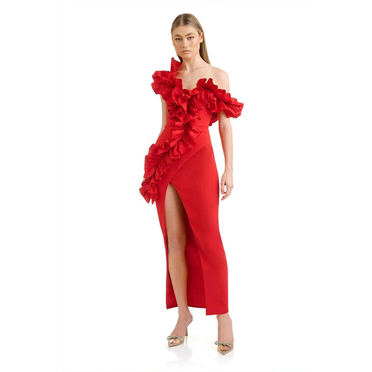 Vestido bandage rojo vuelos en gasa roja en hombro y bajos