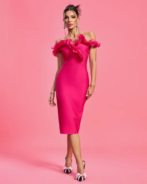 Vestido bandage rosa acabado en plumas tiras cruzadas