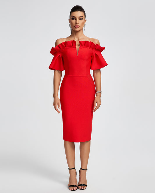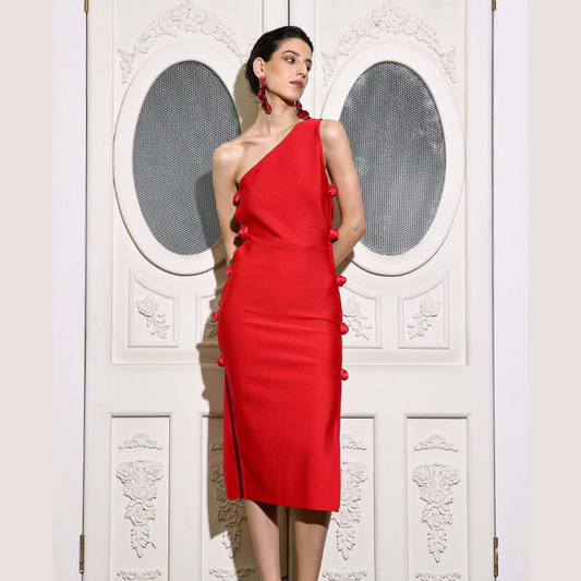 Vestido bandage color rojo con rosas a los laterales , hombro descubierto