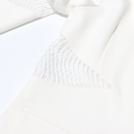 Traje Blanco tejido bandaje , con cuello y mamga larga , detalle de flor en relieve
