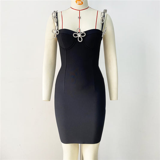 Vestido negro bandage corto con detalles plateados en tiras y escote / ann