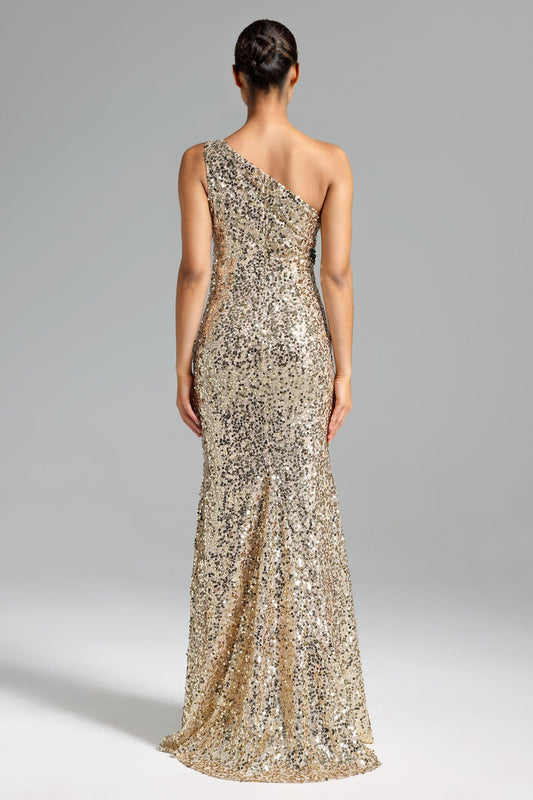 Vestido lentejuelas con hombro descubierto , color dorado y detalle verde