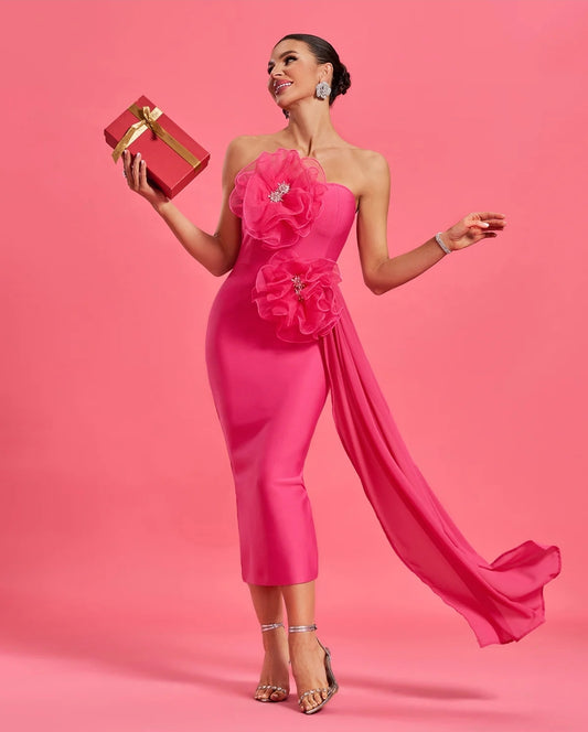 Vestido bandage color rosa con flores en relieve, palabra de honor