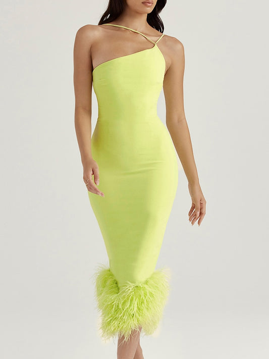 Vestido de plumas con cuello diagonal