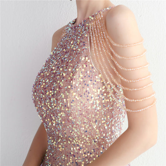 Vestido lentejuelas de gala largo, hombro descubierto color rosa