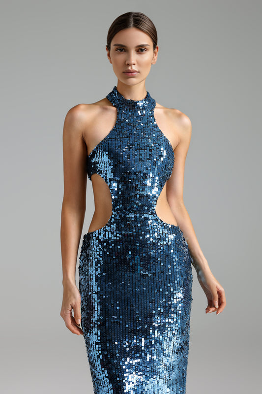 Vestido de gala lentejuelas color azul con espalda descubierta colección ocslen