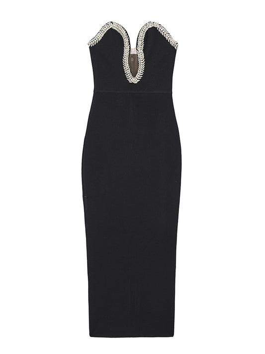 Vestido bandage color negro con acabados plateados en bajo y tirantes