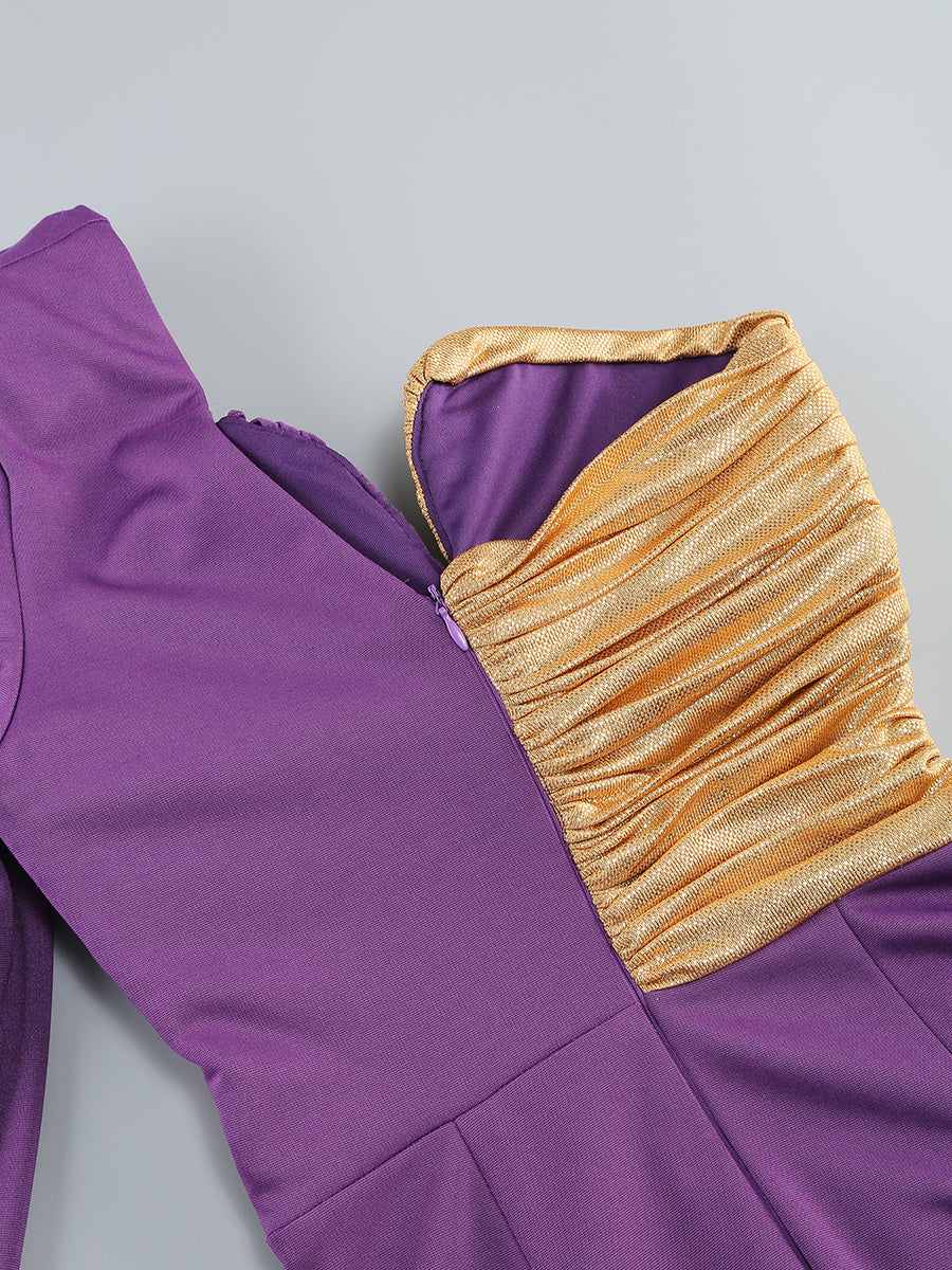 El hermoso vestido lila y dorado presenta una elegante combinación de colores y una manga larga con hombro descubierto. Asegúrate de tomar tu talla antes de pedir para un ajuste perfecto. Disfruta de un look sofisticado y cómodo con este vestido único.